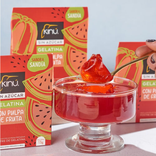 Mezcla en polvo para preparar postre de gelatina sin azúcar sabor Sandía, con pulpa de banano.